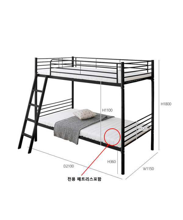 전체 : w 115 x d 210 x h 180 cm / 매트리스 : w 110 x d 10 x h 200 cm