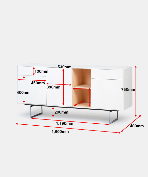 w 1,600 x d 400 x h 750 mm
