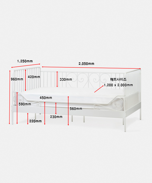w 2,050 x d 1,250 x h 960 mm 싱글매트리스 포함